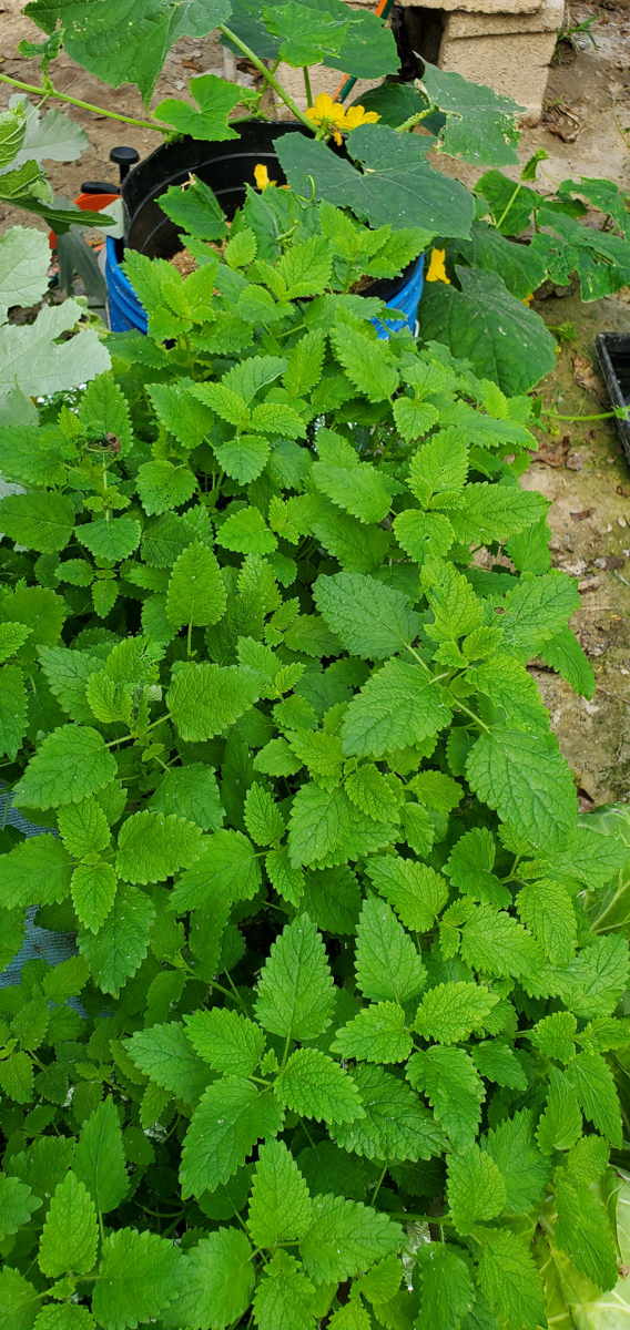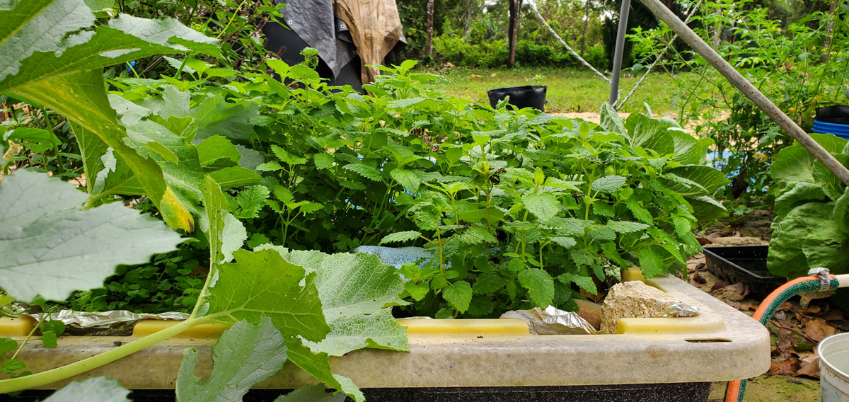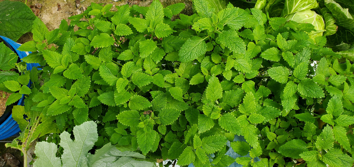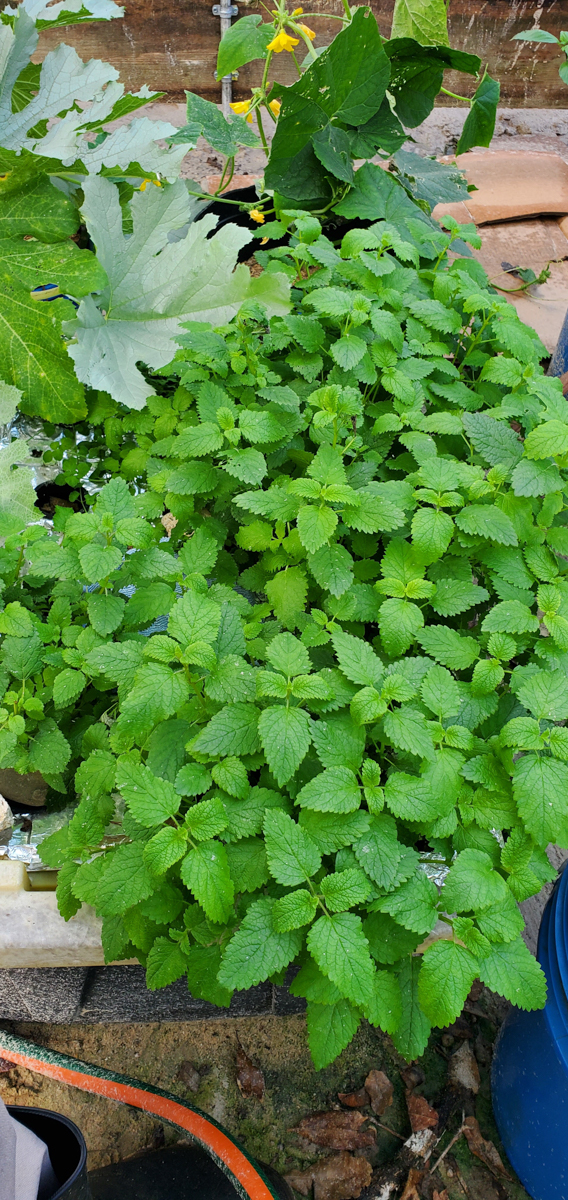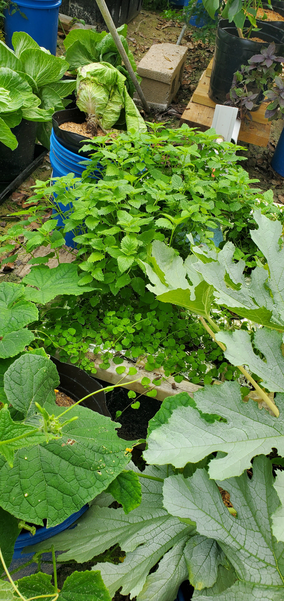 The lemon balm and peppermint are getting more prominent as well. I was worried about the peppermint because it had been in a tote of nutrients and was starting to die. I thought it was because it didn't like its roots continuously wet. That wasn't it. The problem was its roots didn't touch the nutrients. It was placed in a tote with kale, and the kale grew faster than the peppermint, so the nutrients went down faster than the peppermint could grow. The peppermint was left high and dry. I moved the peppermint to the tote with the lemon balm, and it has thrived.