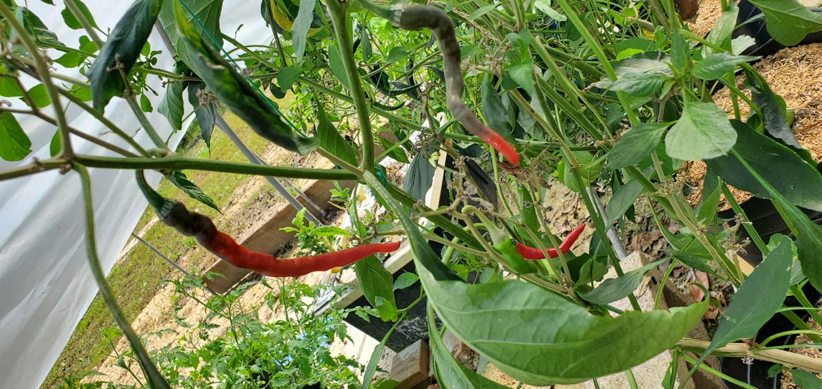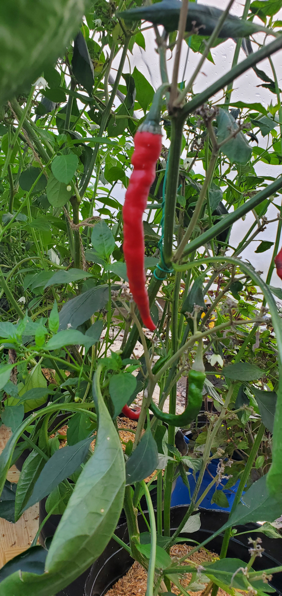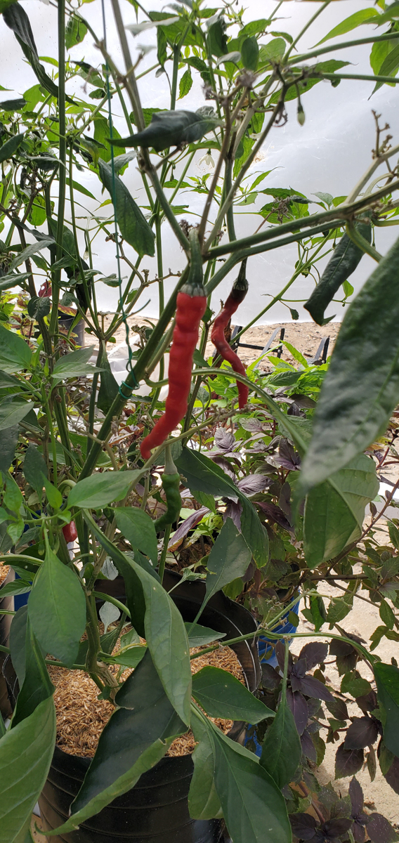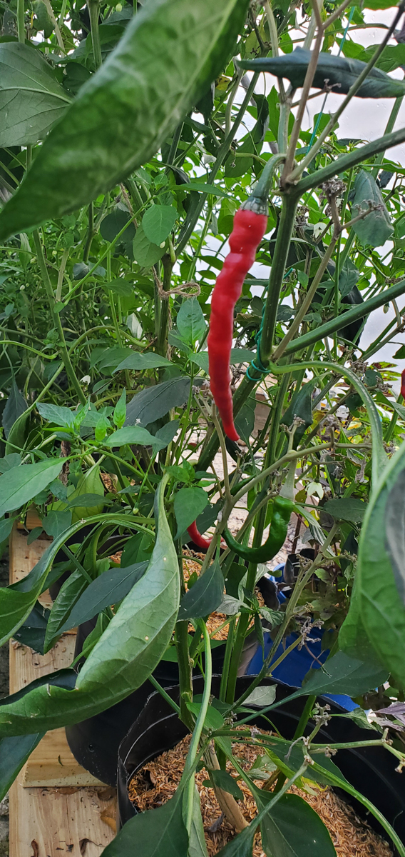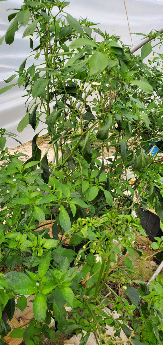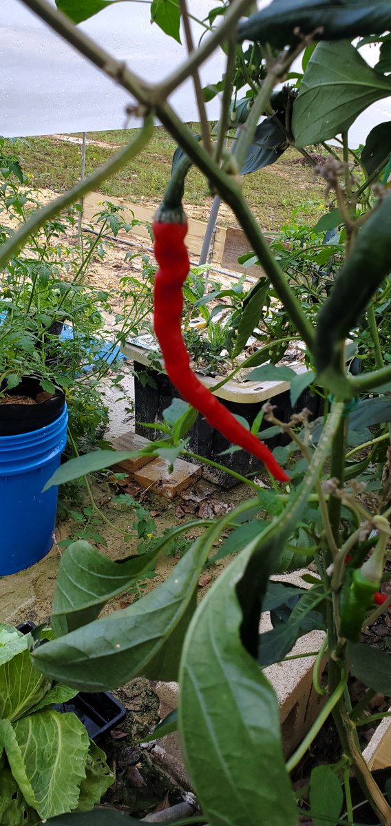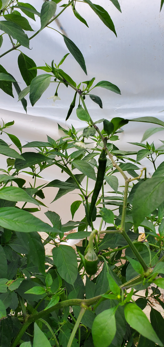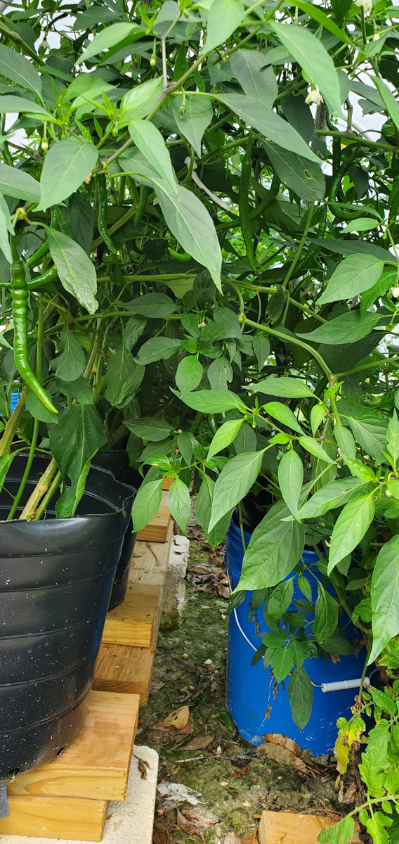 The Cayenne peppers are doing better. The plants were full of leaves and flowers but no peppers. I was worried that with the change of adding them to the rain gutter grow system, they would not do as well. But they have stabilized and are now producing peppers.