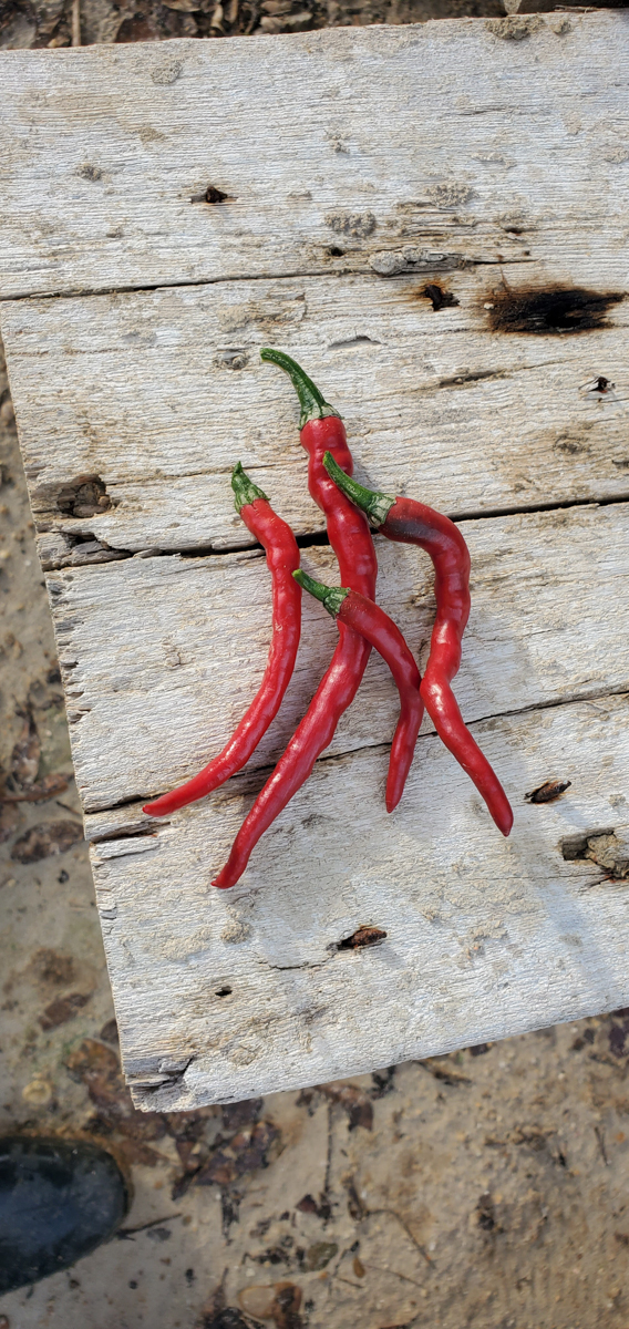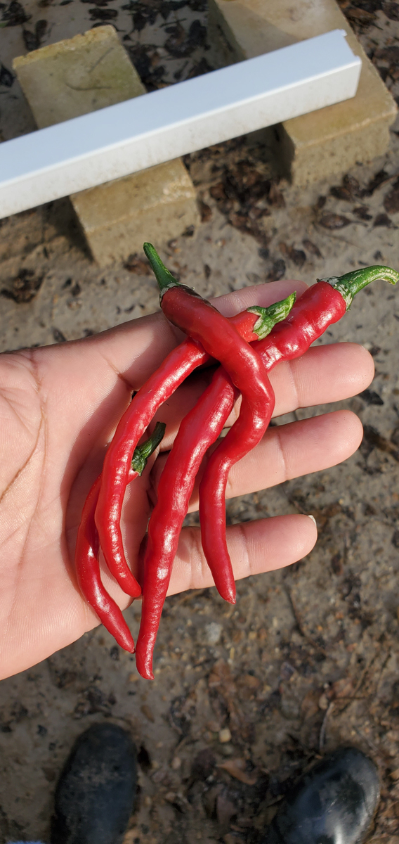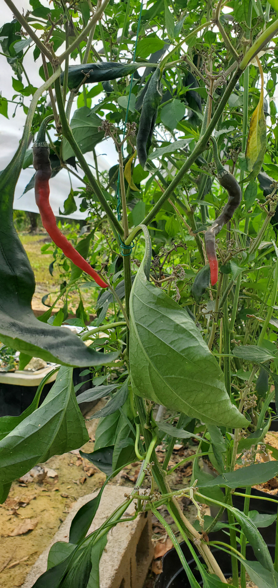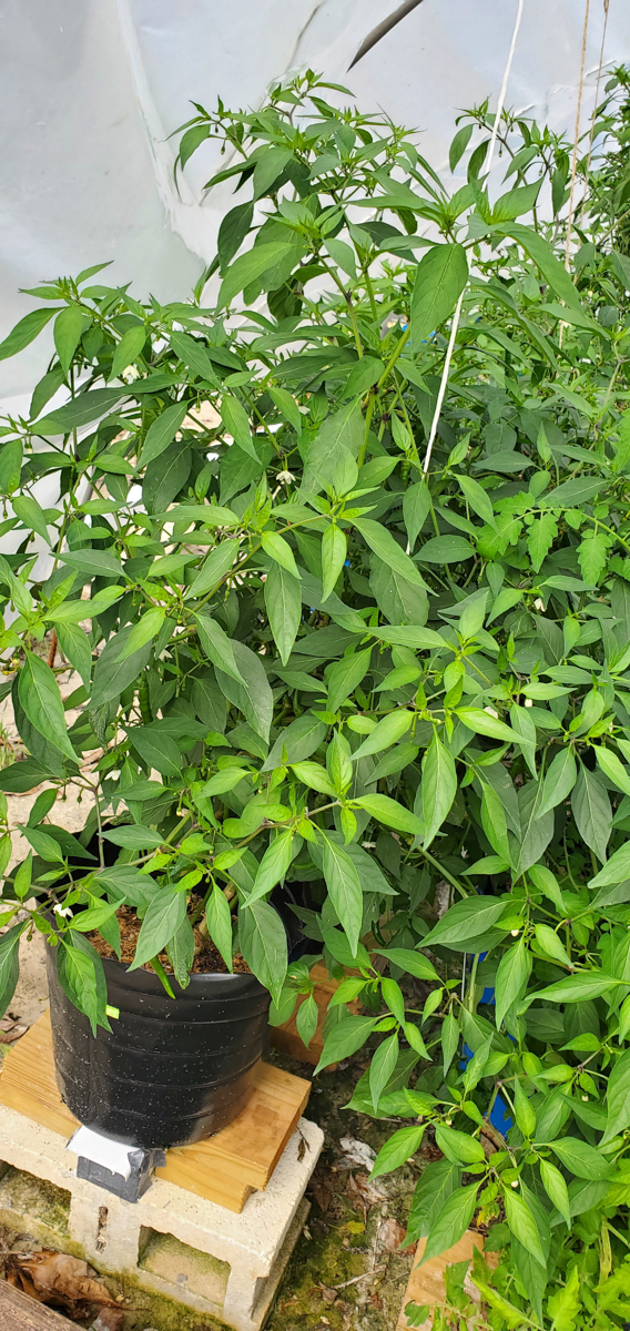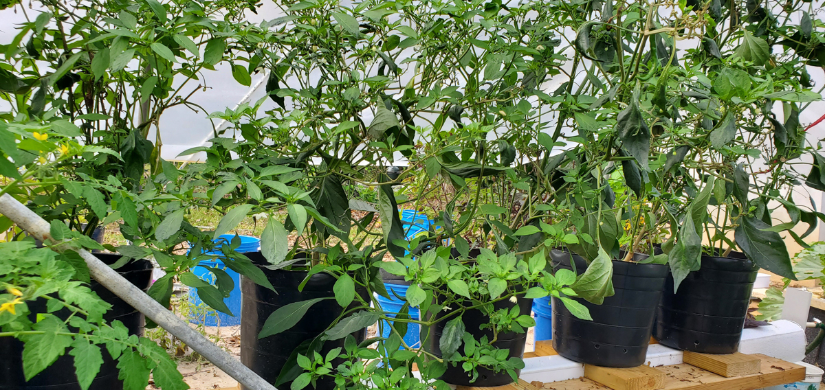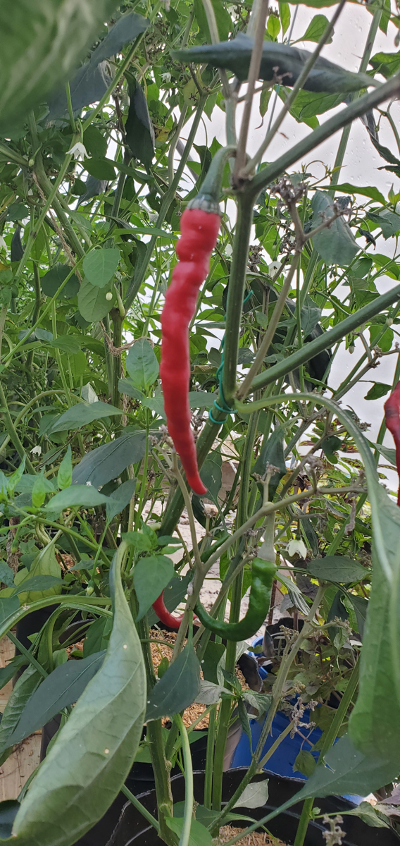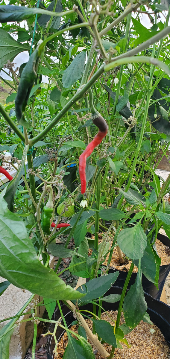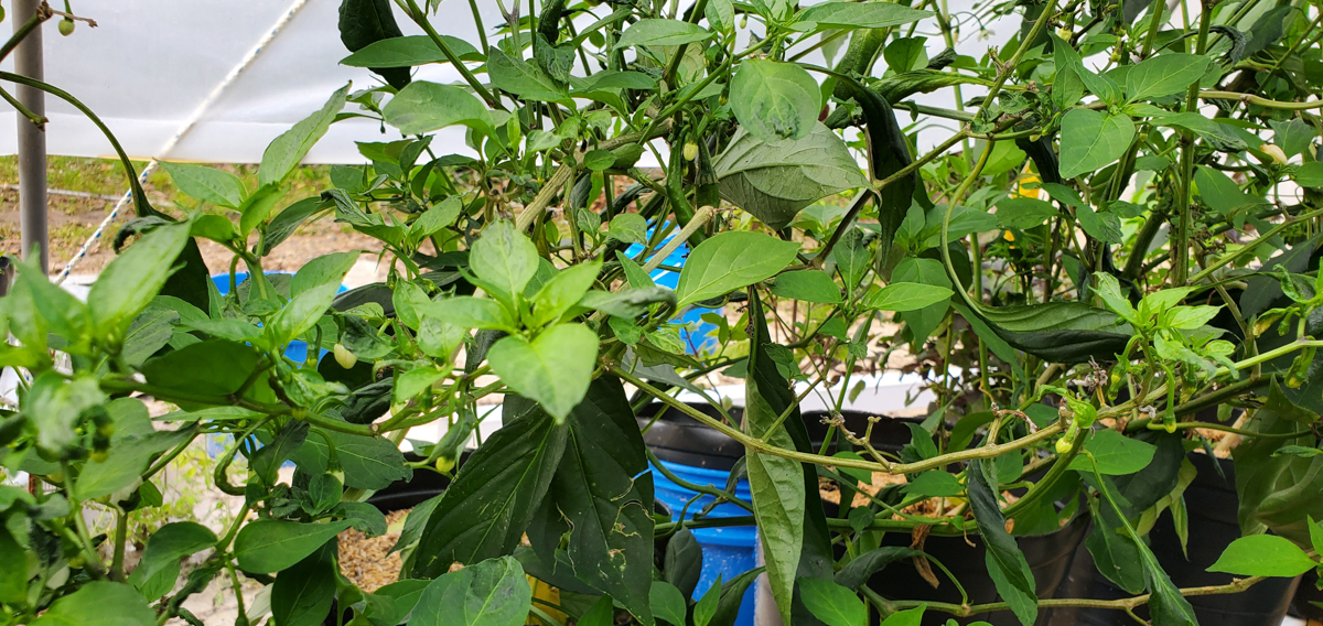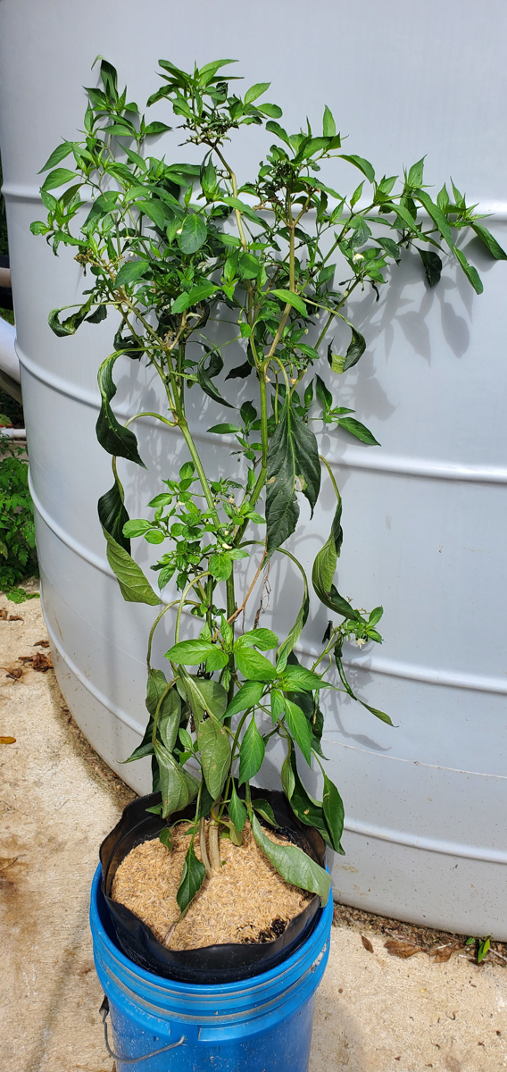 The Cayenne peppers are doing better. The plants were full of leaves and flowers but no peppers. I was worried that with the change of adding them to the rain gutter grow system, they would not do as well. But they have stabilized and are now producing peppers.