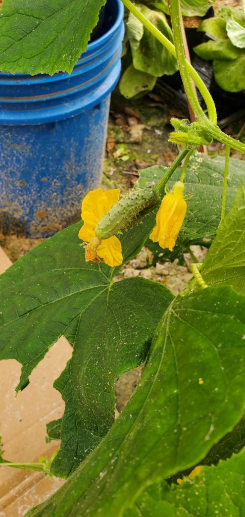 Cucumbers are starting to produce. I think there are two thus far. I was shocked that they were producing so soon. The plant is only about 6ft long.