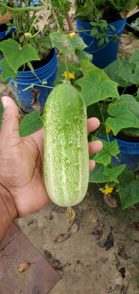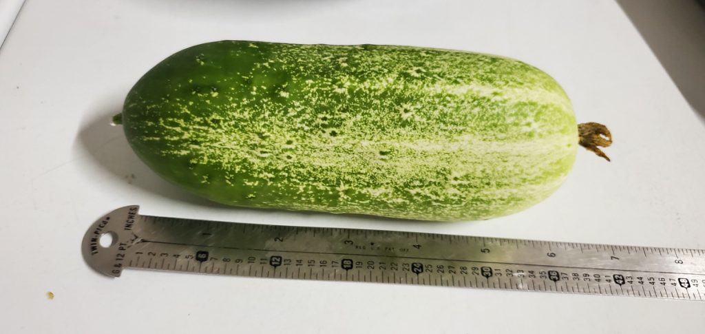 I harvested one cucumber today! It weighed in at 355g / 0.782641 lbs.