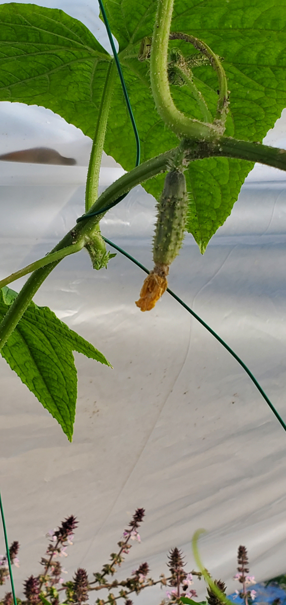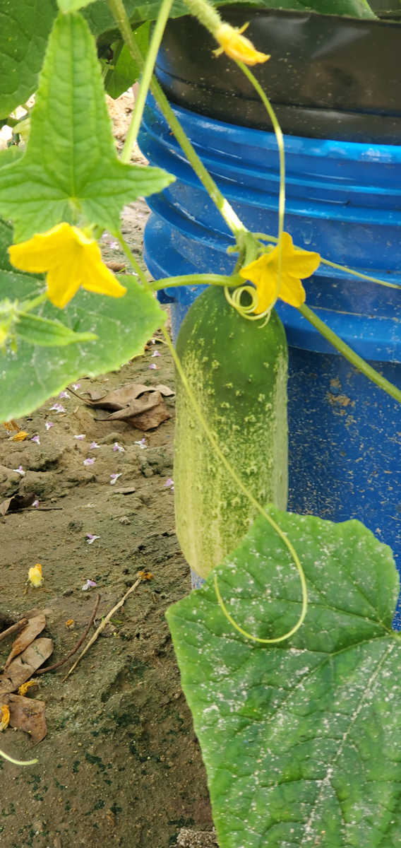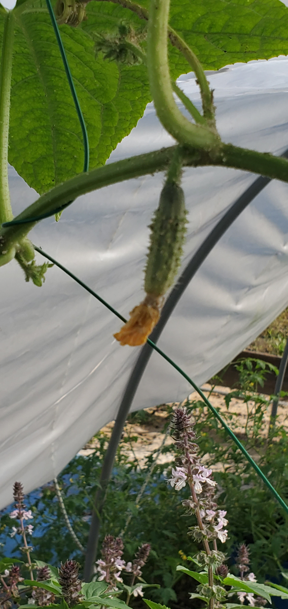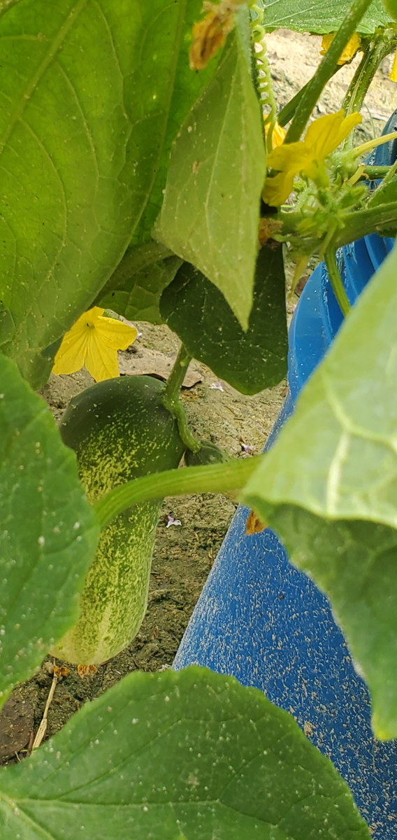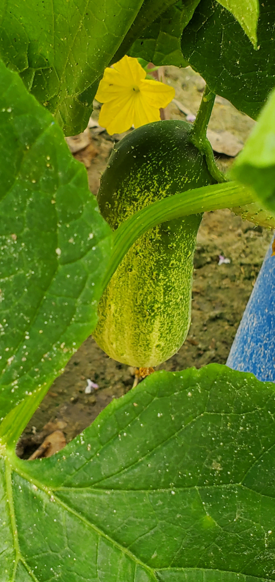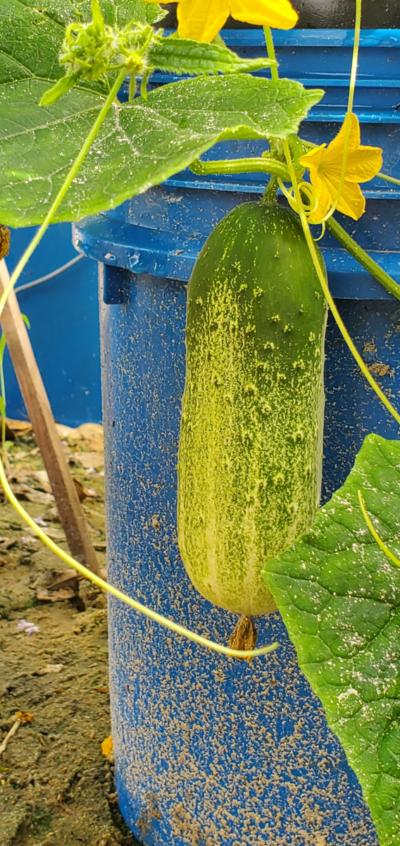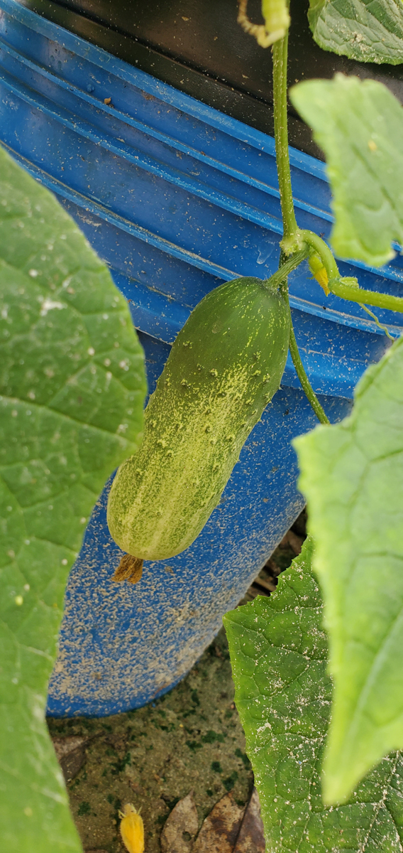 These are Pickle Barrel Hybrid cucumbers from Burpee Seed Company. This is one of ten seeds that germinated. I wasn't expecting this one to survive because I moved it around so much. I placed it at the end of the temporary hoop house, and it seemed to like that spot. I just fed it every two days or so, and here are the results so far.