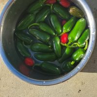 I made another harvest of greens and peppers. The pepper plants have been really generous so far, and I think I have pulled about 50 peppers off between two of the plants. The third plant has only grown about 5 or 6 inches in height, and it still produced two peppers I can eat. These are grown from seeds I saved from some peppers we ate a while back. Whenever we have vegetables with seeds, I try to produce crops from those seeds. So the seeds from these peppers I have already started planting.