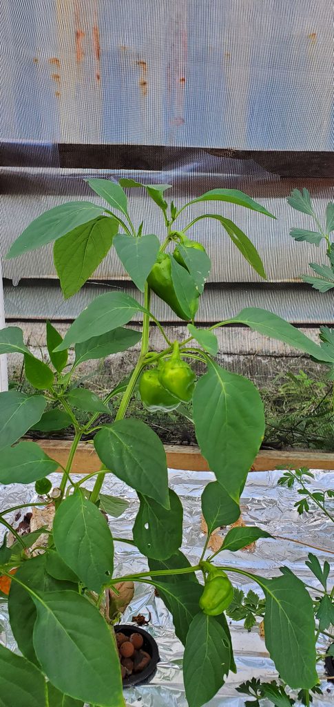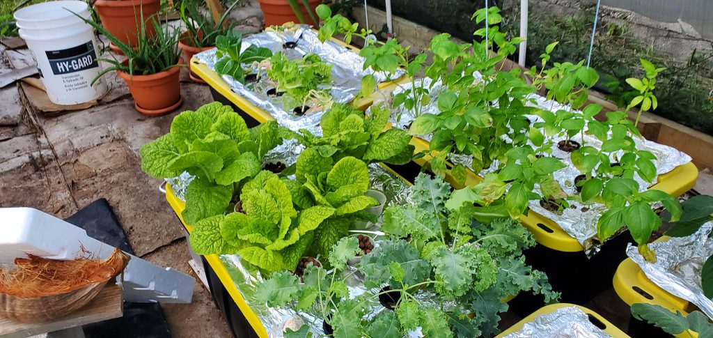 This is what things look like after I have now harvested a few items. The kale is about ready to harvest. The basil is ready to harvest. The lettuce in the far back is past due for harvesting.