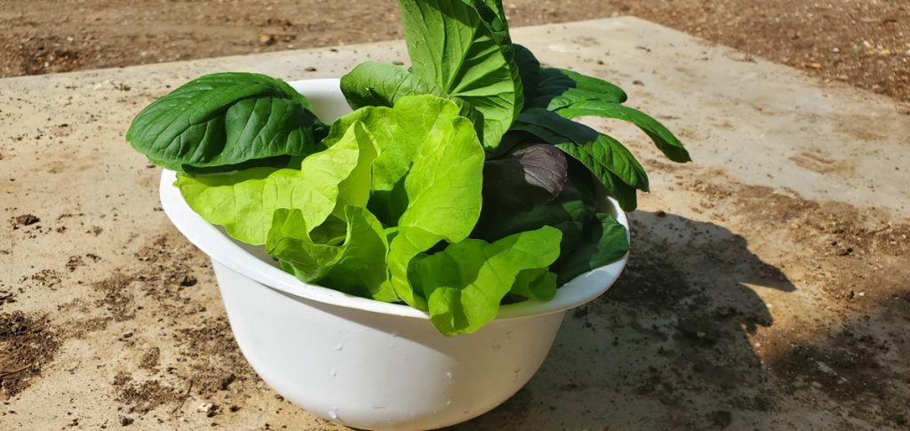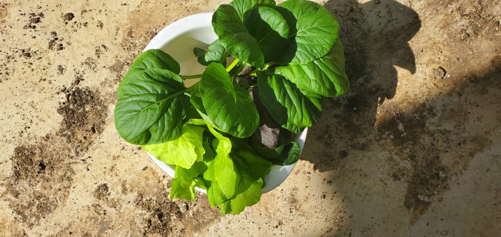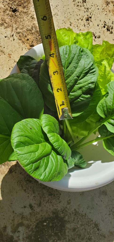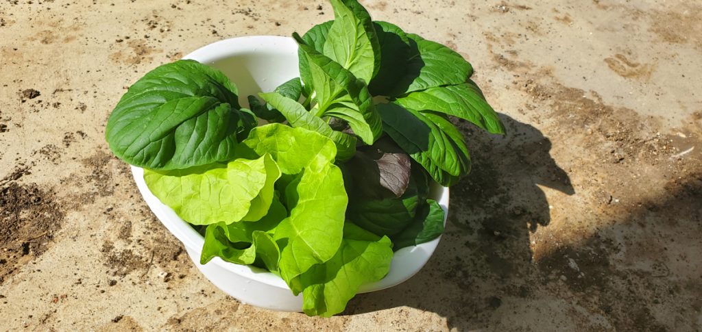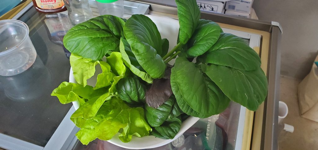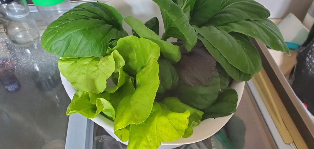 The greens did rather well. I was astonished. I have already cleaned the greens container, except for three plants still growing. I will replace the empty spots and continue with those. Here are a few shots from the last harvest of greens