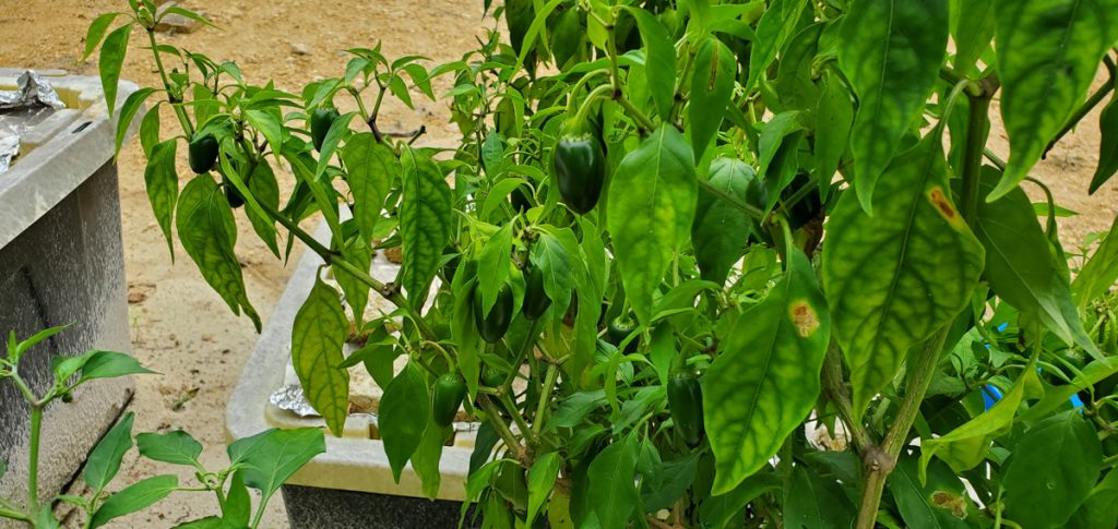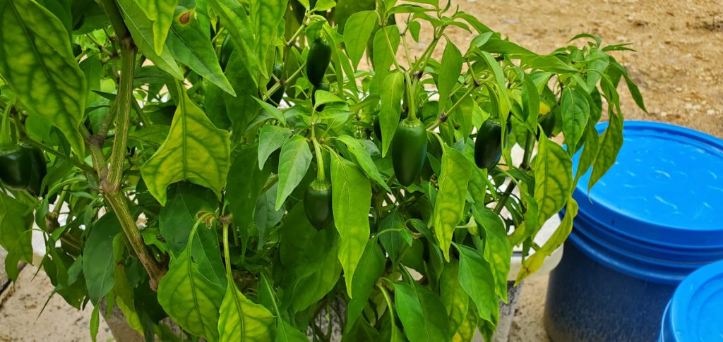 The jalapenos have started producing more peppers. I was worried about them for a little bit. I checked their totes and found that they had too much water in them. We had rain every day in July, and it filled their totes to the brim; their roots couldn't breathe. I emptied out half of the water and balanced out the nutrients, and they popped into action. Between bush #2 and #1, there are about 30 peppers currently. Bush #3 is starting to produce more, it only produced 2 earlier this year. But it has produced 3 large ones already, and it is still half the size of bush #2 and #3.
