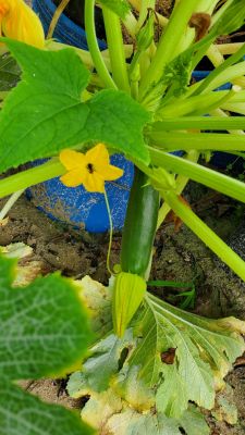 Well, we may get an editable zucchini from this latest plant. This was another plant I was unsure about because I handled it. But I placed it next to the Pickle Barrel Hybrid Cucumber plant, which has been doing well. I will admit that it did start with about three zucchinis, but then they all died within a week. Then it started a fourth, and it has continued to grow well.