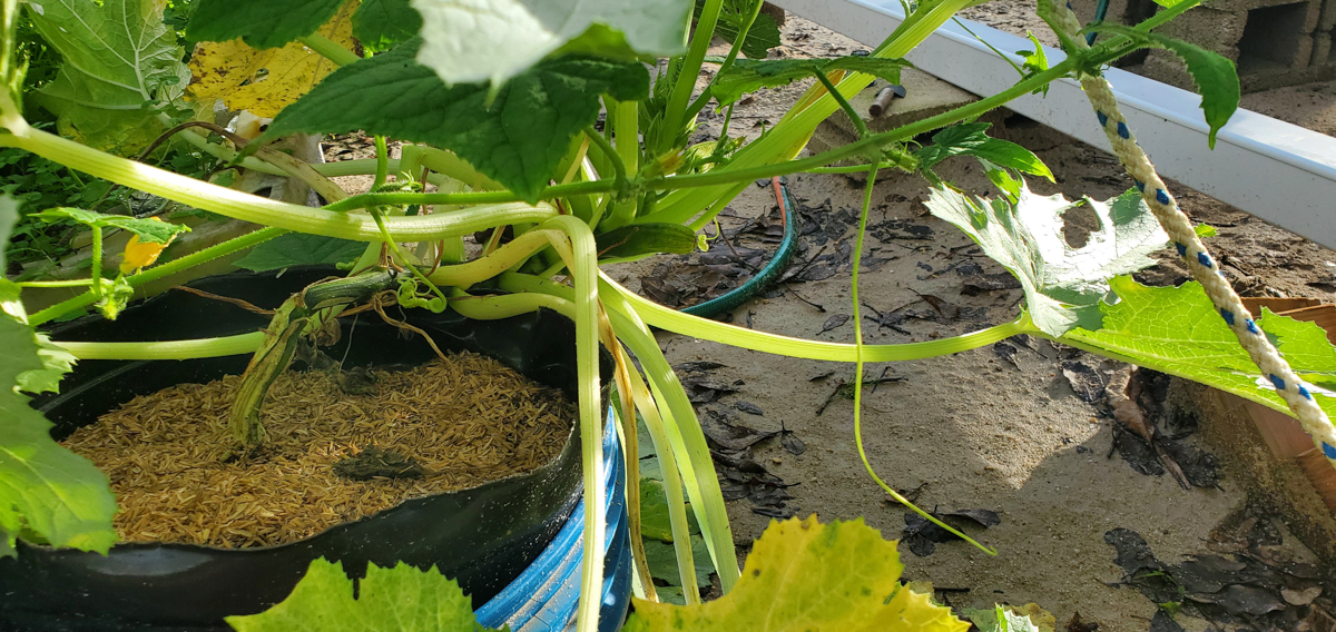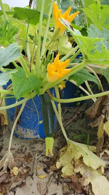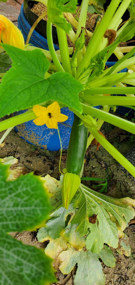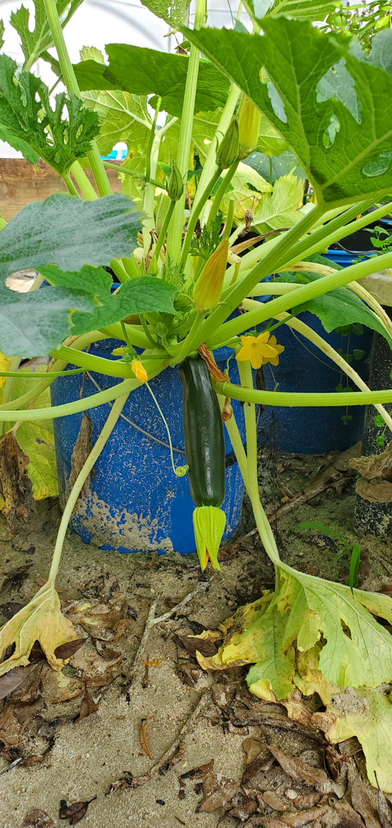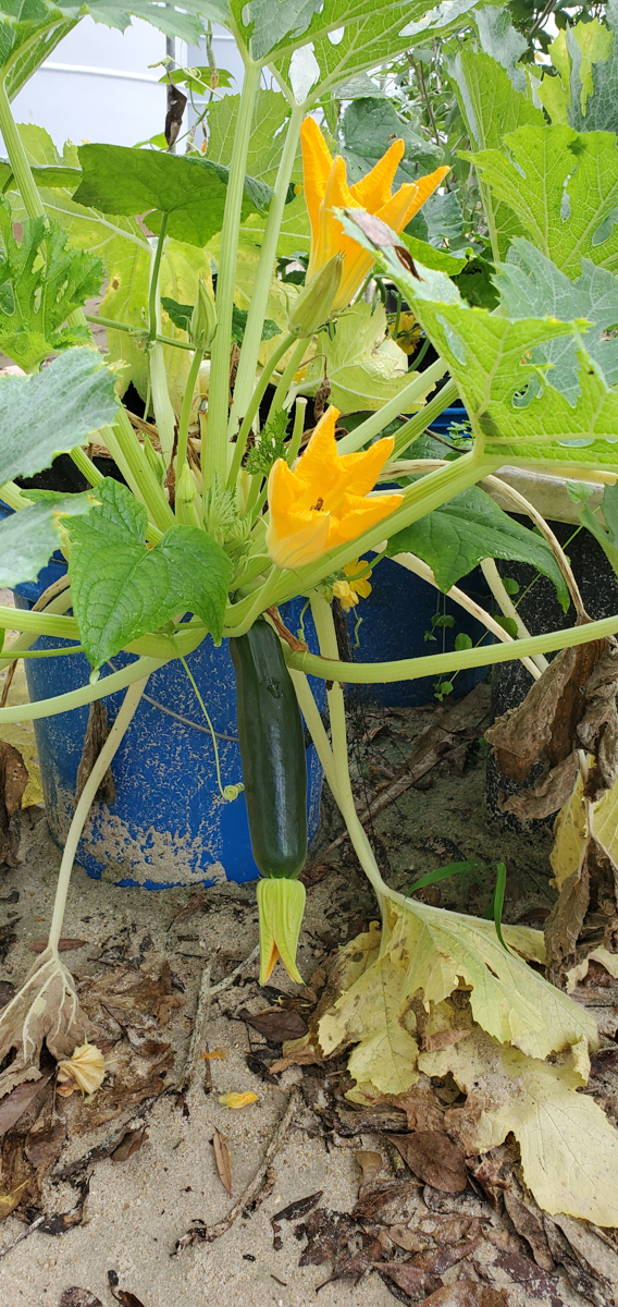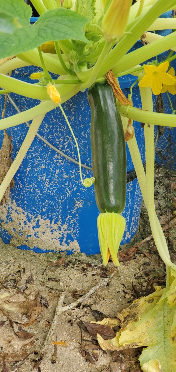 Well, we may get an editable zucchini from this latest plant. This was another plant I was unsure about because I handled it. But I placed it next to the Pickle Barrel Hybrid Cucumber plant, which has been doing well. I will admit that it did start with about three zucchinis, but then they all died within a week. Then it started a fourth, and it has continued to grow well.